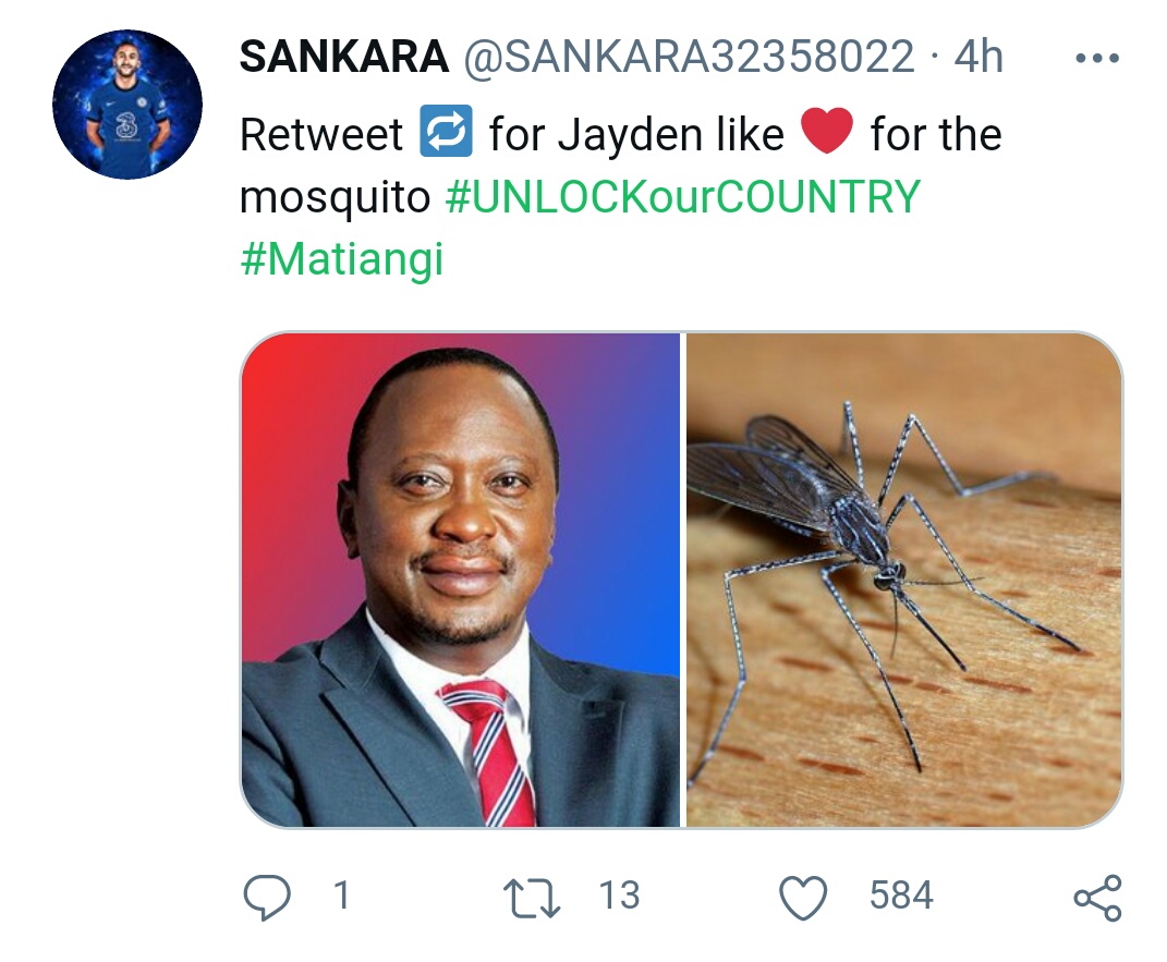 Until the time this was published, Uhuru had twelve retweets while the mosquito had garnered hundreds of likes.