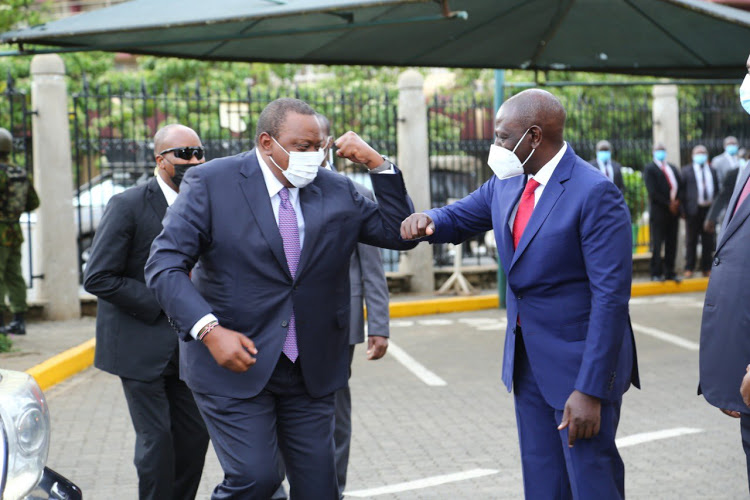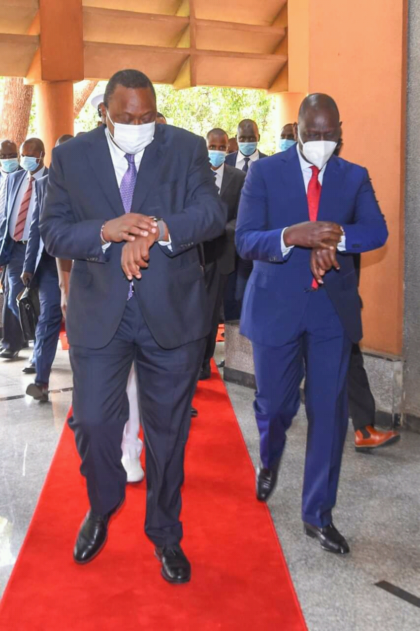 Uhuru and Ruto bumped their elbows with plastic smiles beneath their face masks. Our journalist present at the event said the tension in the air could be cut with a knife.